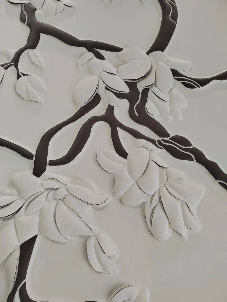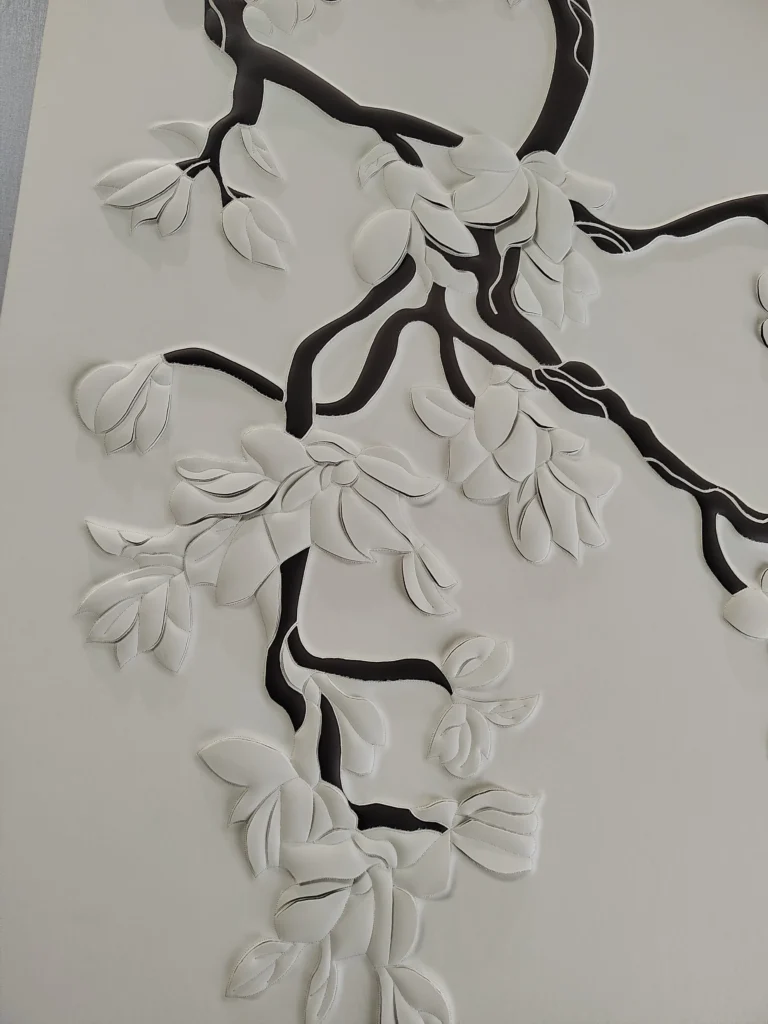 The design brief called for a striking visual anchor that wouldn’t overwhelm the minimalist walnut furniture and modern brass lighting. Our solution was a highly detailed, dual-panel installation featuring an organic, floating tree branch adorned with delicate magnolias and a resting bird.